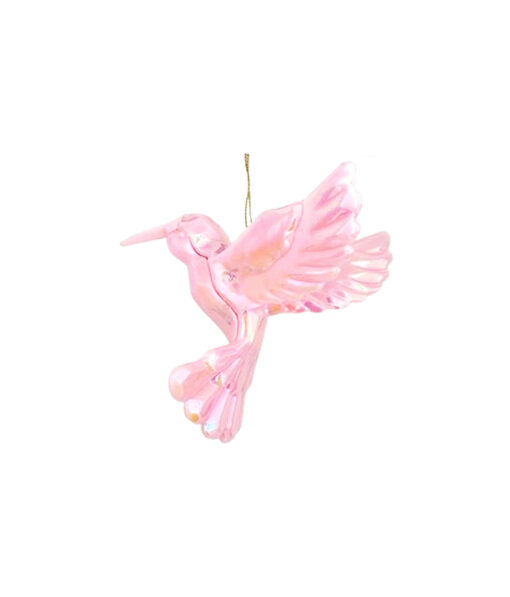 Add whimsical charm to your holiday decor with the Pink Iridescent Buzzing Bird Ornament 41g.