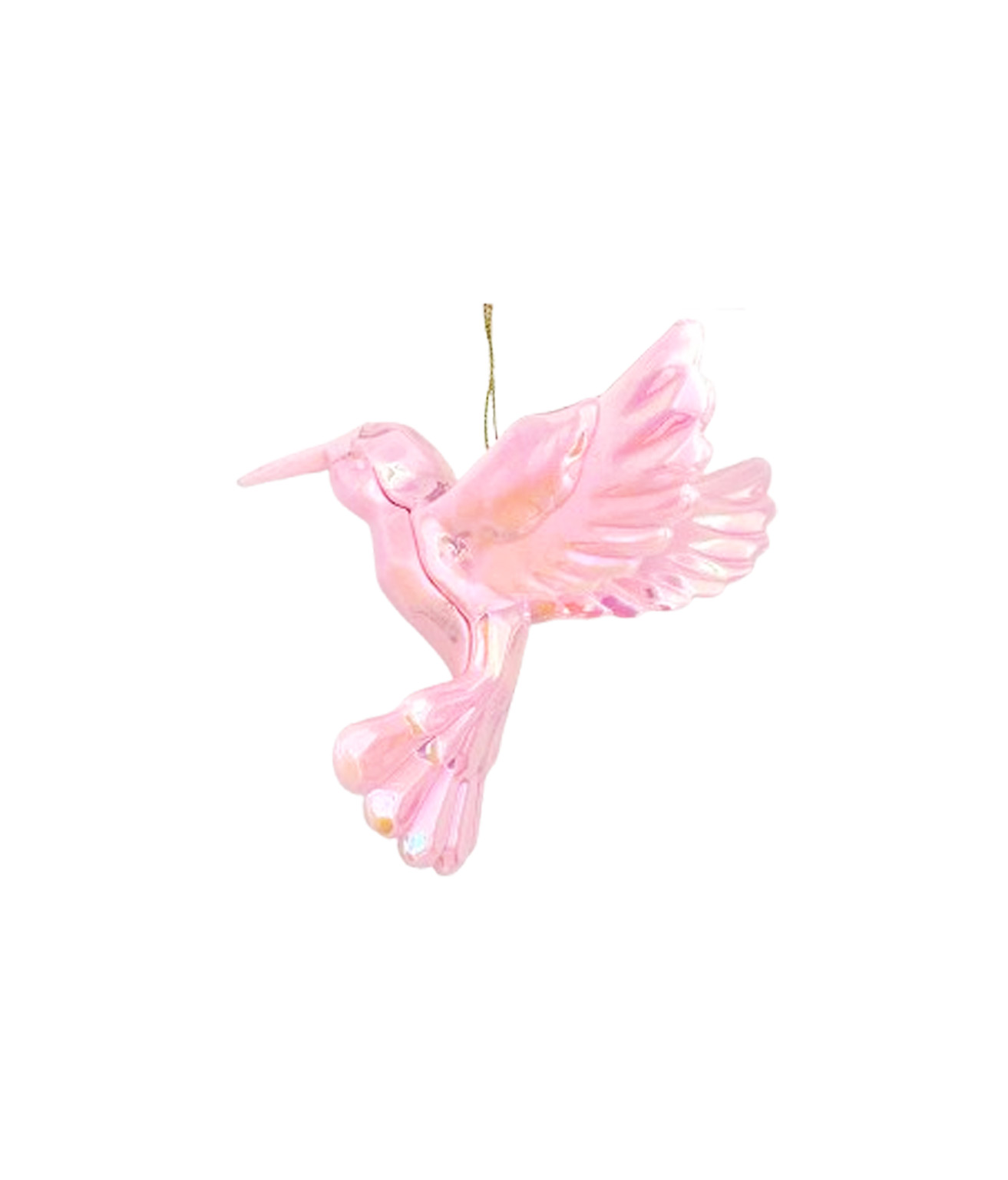 Its soft pink body and shimmering iridescent finish bring a playful yet elegant touch to trees, garlands, or festive displays.