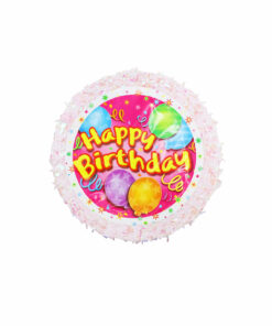 This colourful party pinata features a cheerful “Happy Birthday” message, striped pink background, confetti, and balloon illustrations—perfect for adding fun and flair to any birthday celebration.
