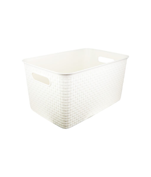 Cream color plastic storage bin.