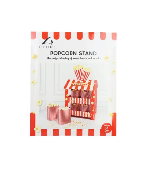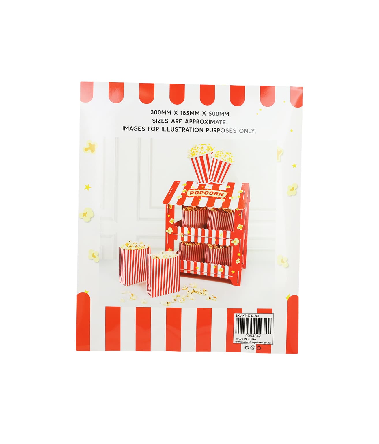A vibrant popcorn stand set ideal for movie nights, parties, and events. Features bold red and white stripes with themed signage and tiered display shelves.