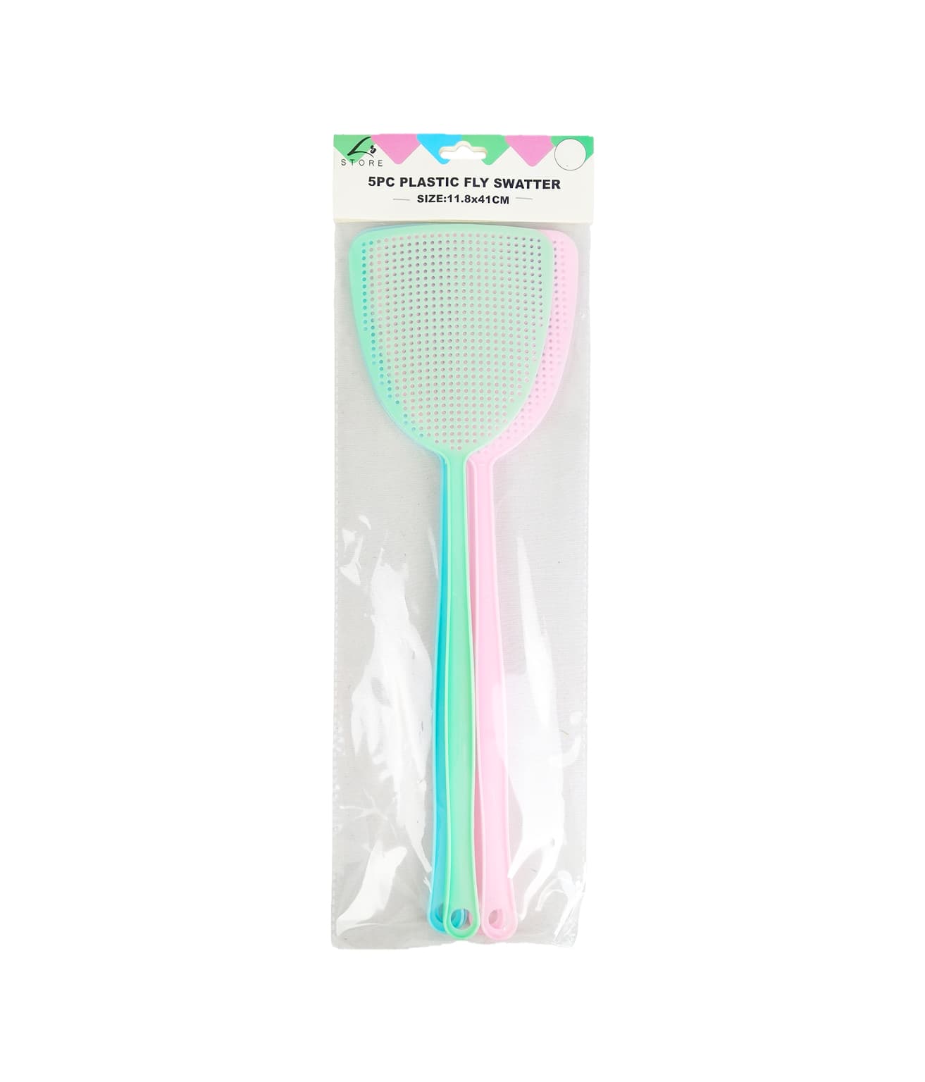 This is a 5-piece set of PP manual fly swatters (size 11.8×41cm), made of lightweight plastic with a perforated design, suitable for daily pest control in homes, kitchens, or outdoor spaces.