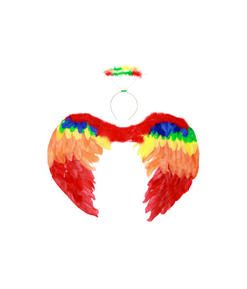 Rainbow angel wings and headband set, perfect for costumes, parties, and dress-up fun.