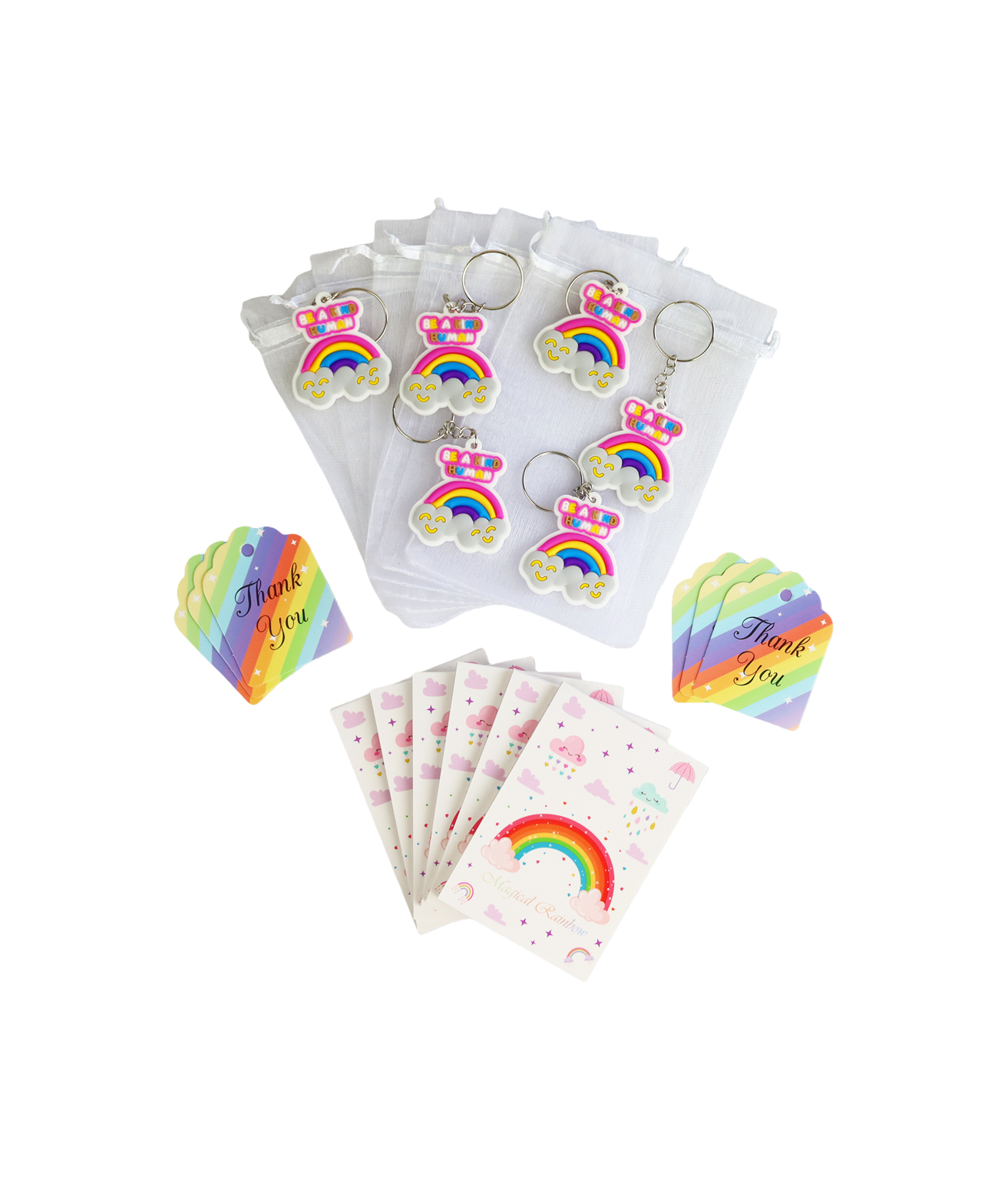 A complete 24 piece gift bag set that includes keychains, gift tags, organza bags, and notepads.