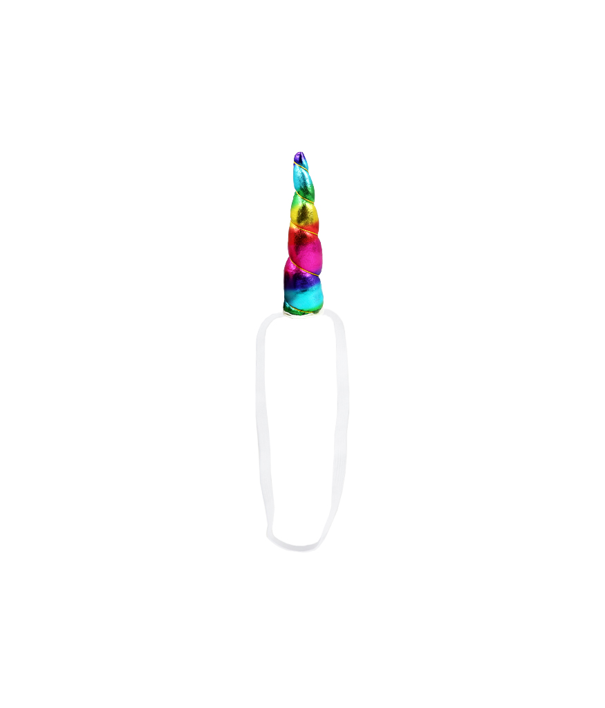 Our unicorn horn features a metallic rainbow colour horn with attached elastic string.