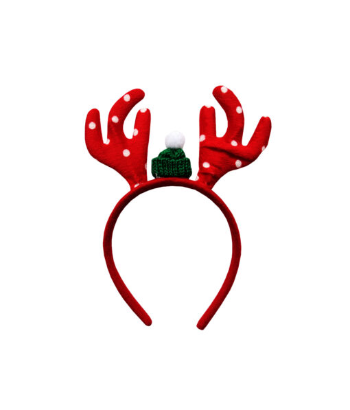 Featuring playful red antlers with white spots and a cute green beanie-style base, it adds fun and charm to your holiday outfit.