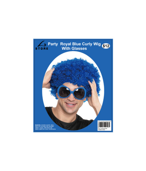 Bring bold flair to any costume or celebration with this Royal Blue Curly Wig With Glasses Party Set.