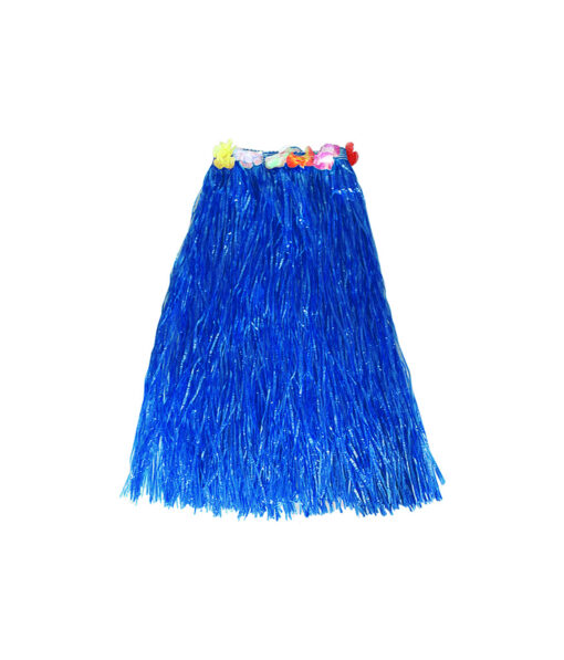 Our Hula Skirt is a raffia-like plastic dance skirt with fabric hibiscus flower accents.