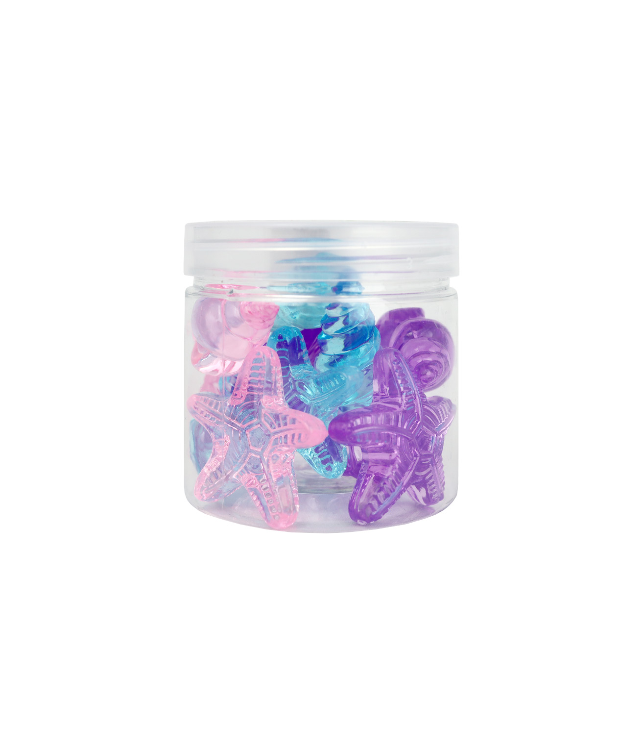 This pack of 12 features a mix of charming sea-inspired shapes in shimmering blue, pink, and purple tones.