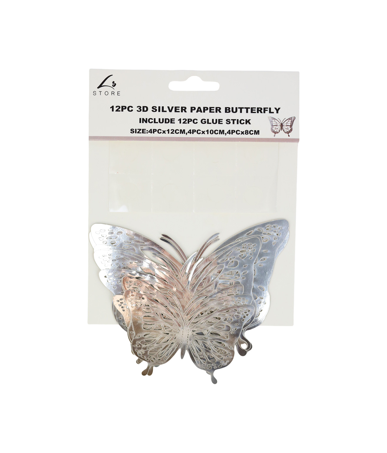 Add a touch of elegance and charm to your crafts with this set of 12 silver 3D Paper Butterflies.