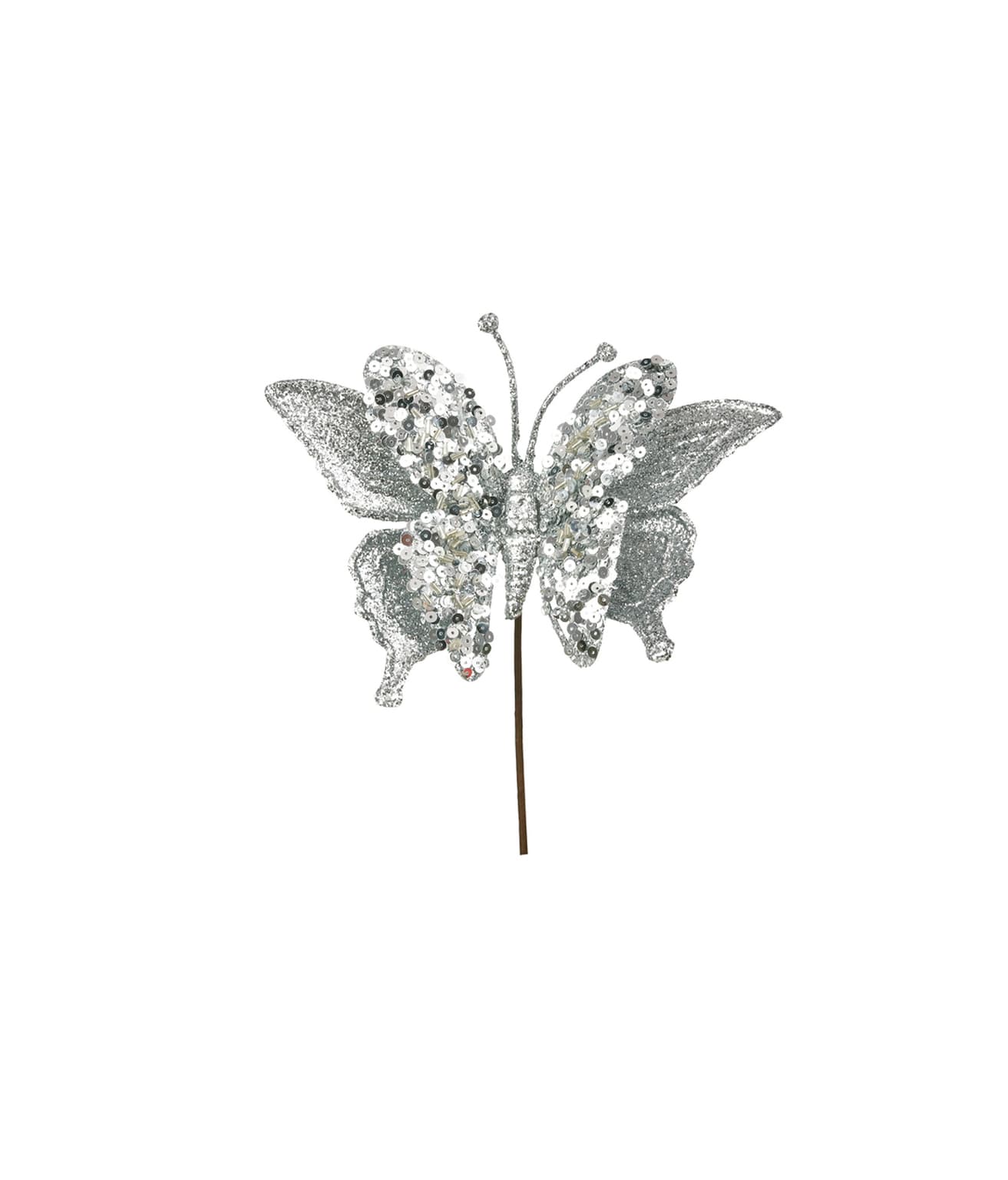Add a sparkling touch to your festive or floral arrangements with this Silver Butterfly With Stem 24cm.