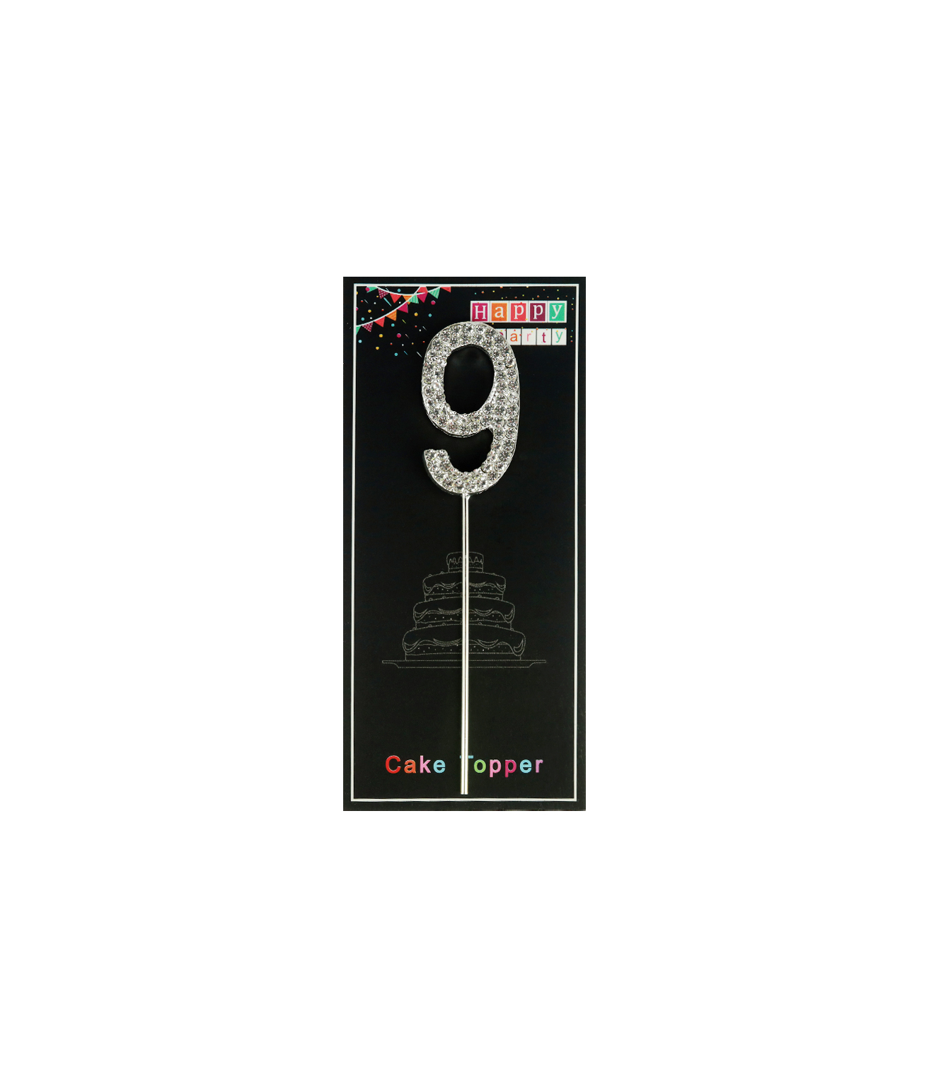 This shining cake topper has a number 9 decorated with diamonds and silver plating.