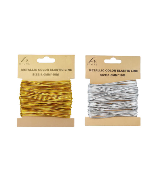 Silver & Gold craft elastic line measuring 10 meters in length and 1.0 mm in thickness.