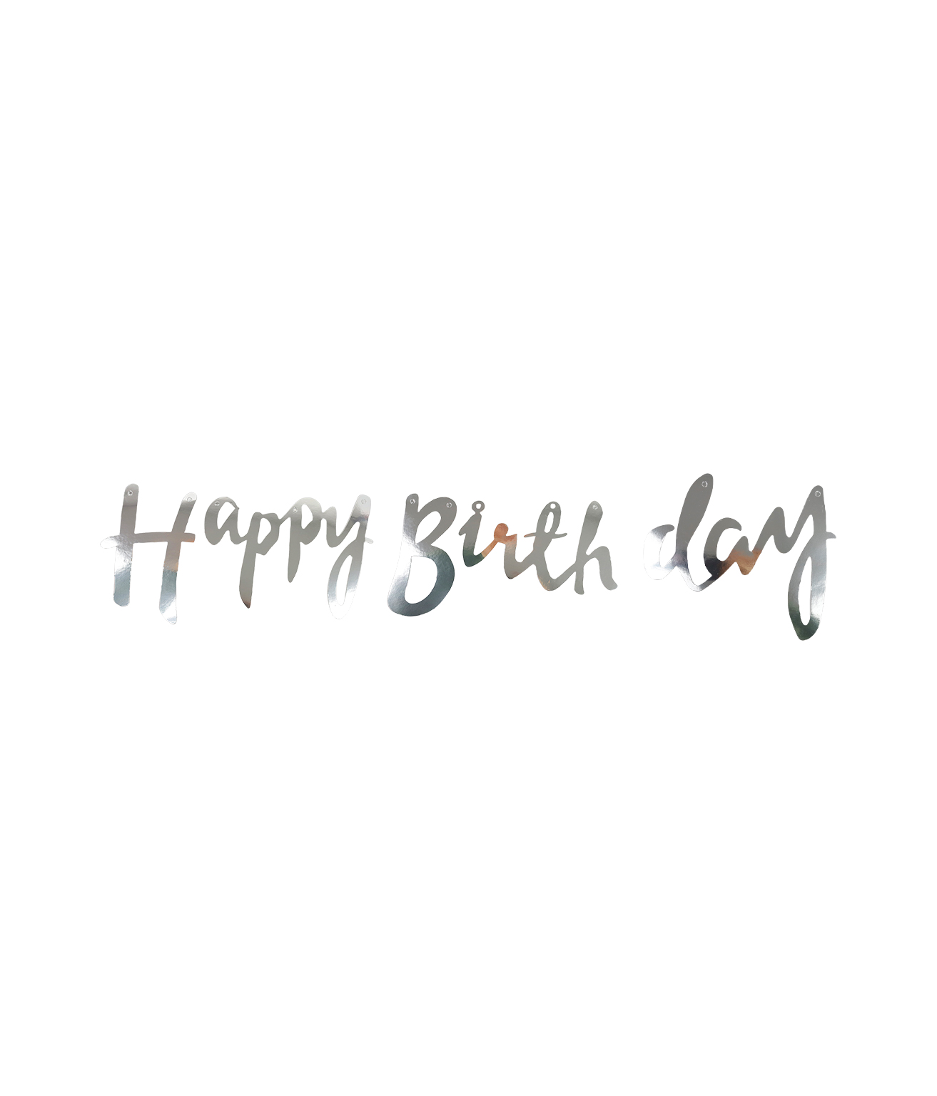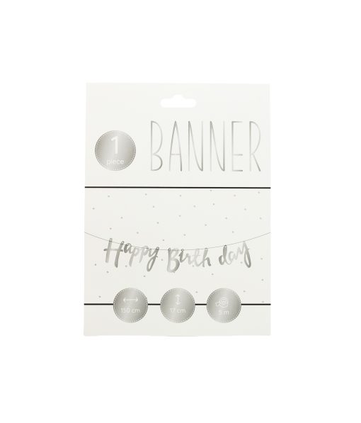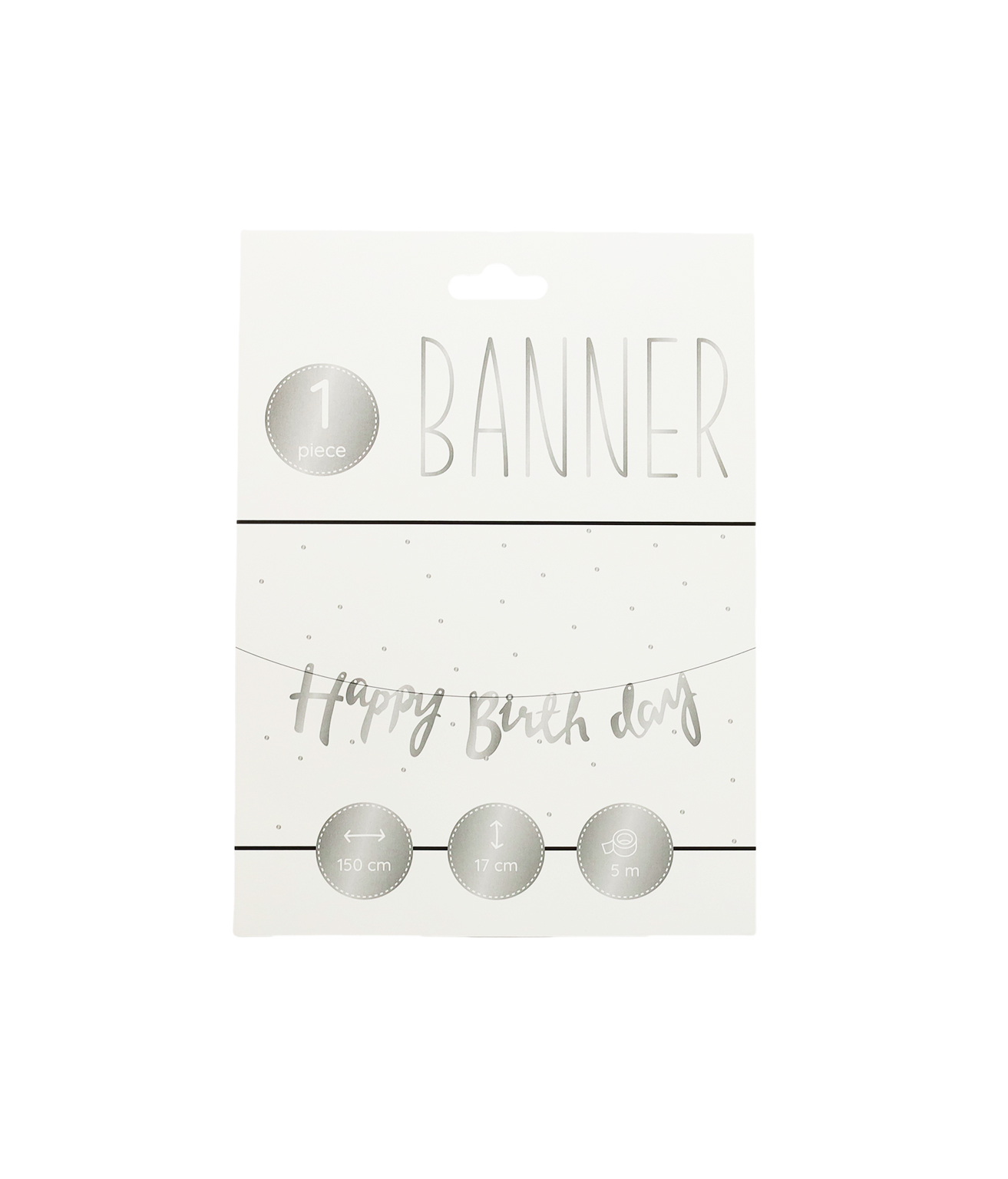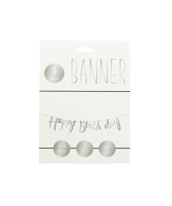 Add some colour to your party with our silver happy birthday banner which comes with twine ribbon.