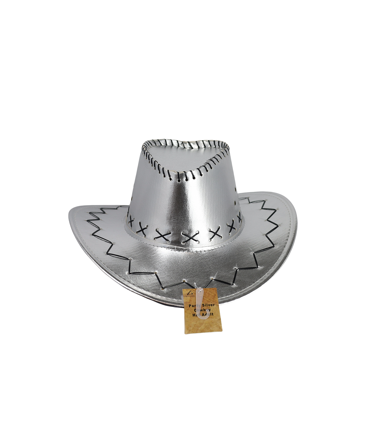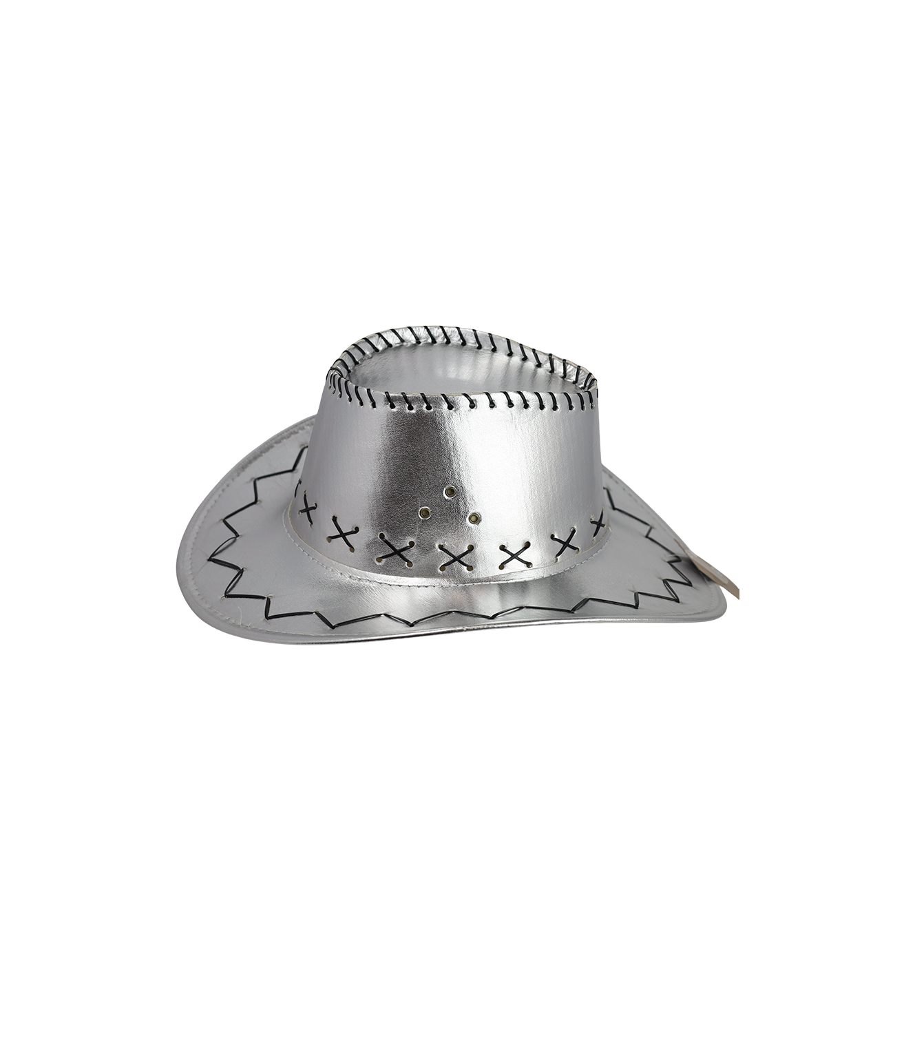 This novelty cowboy hat comes in silver metallic design & attached braided cord which provides a secure fit.