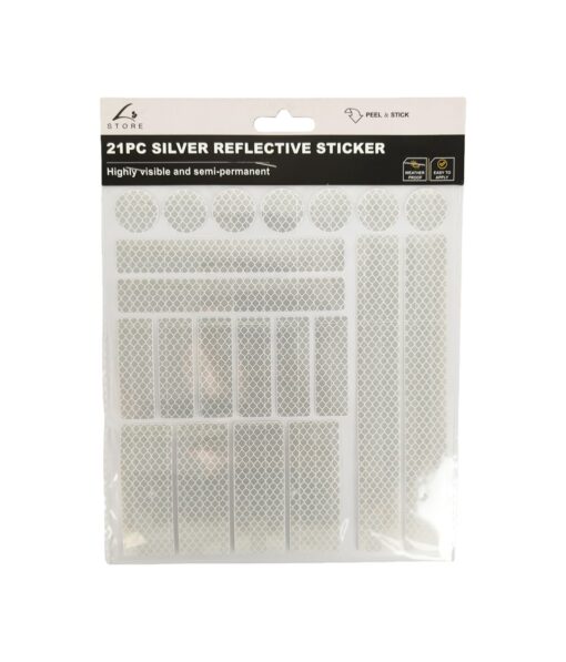 This 21-piece Silver Reflective Sticker Set features a mix of circular and rectangular shapes, designed to boost visibility and safety for a wide range of items and surfaces in low-light conditions.