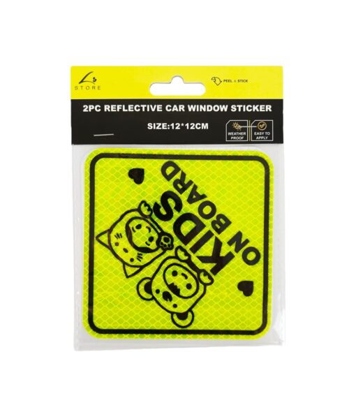 This 2-piece “Kids on Board” Reflective Car Window Sticker Set (12×12cm) is a safety accessory designed to alert other drivers to children in your vehicle, with high-visibility reflective material for day and night use.