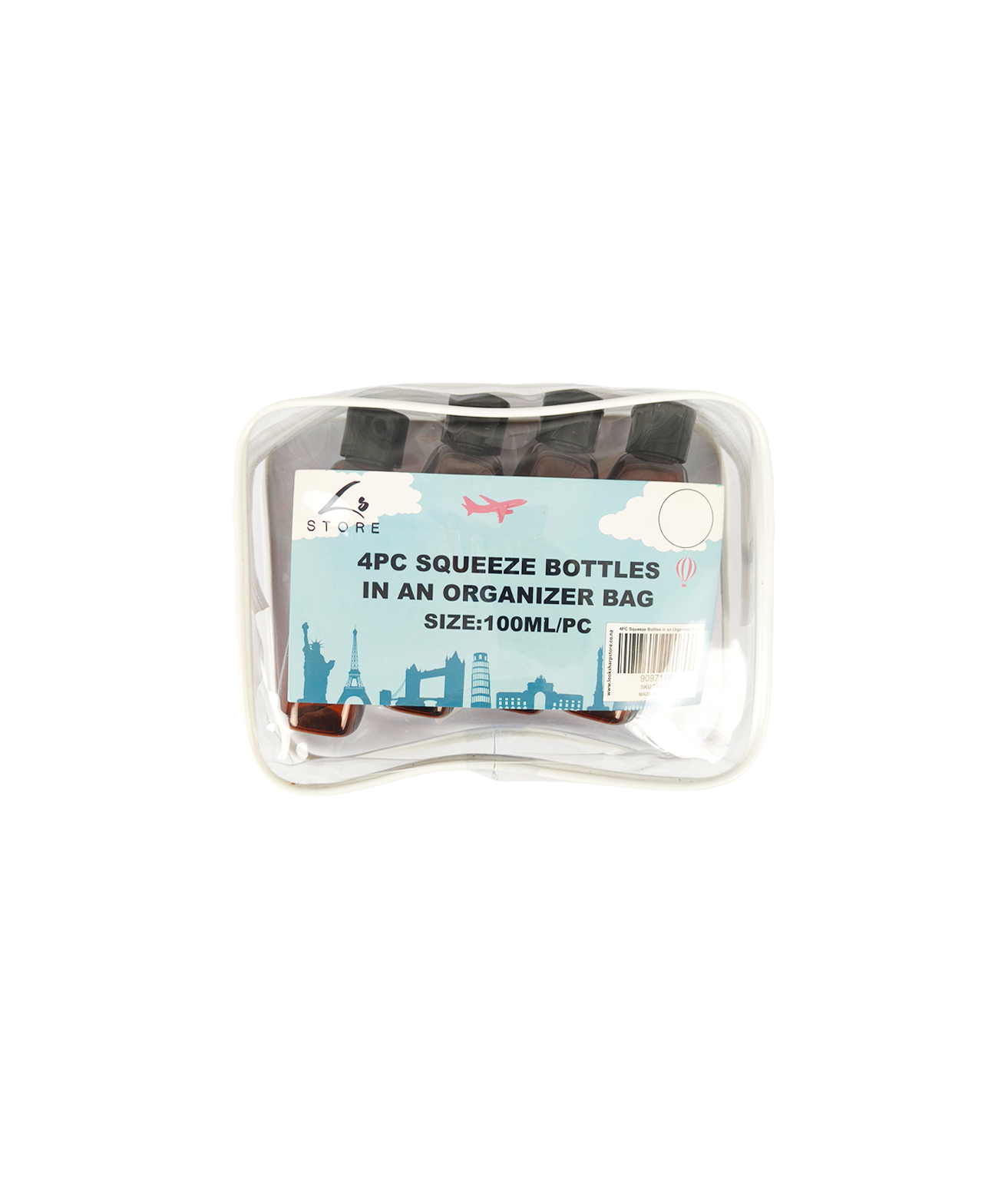 This 4-piece Squeeze Bottles Set (100ml each) in an organizer bag is a travel-friendly solution for carrying toiletries, cosmetics, or condiments, featuring leak-proof caps and a compact, see-through bag for easy organization.