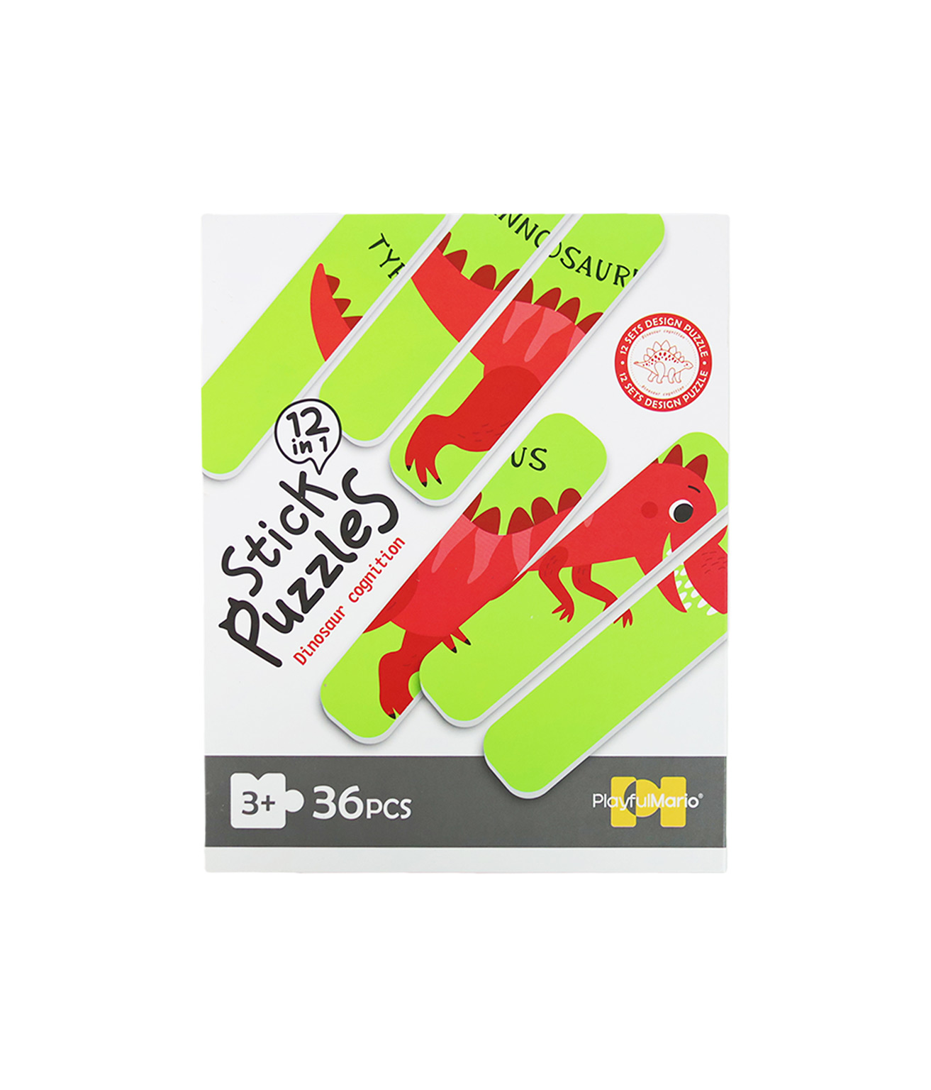 Stick Puzzles set featuring 36pcs, available in 6 assorted designs including lion, excavator, football, eggplant, strawberry, and dinosaur.