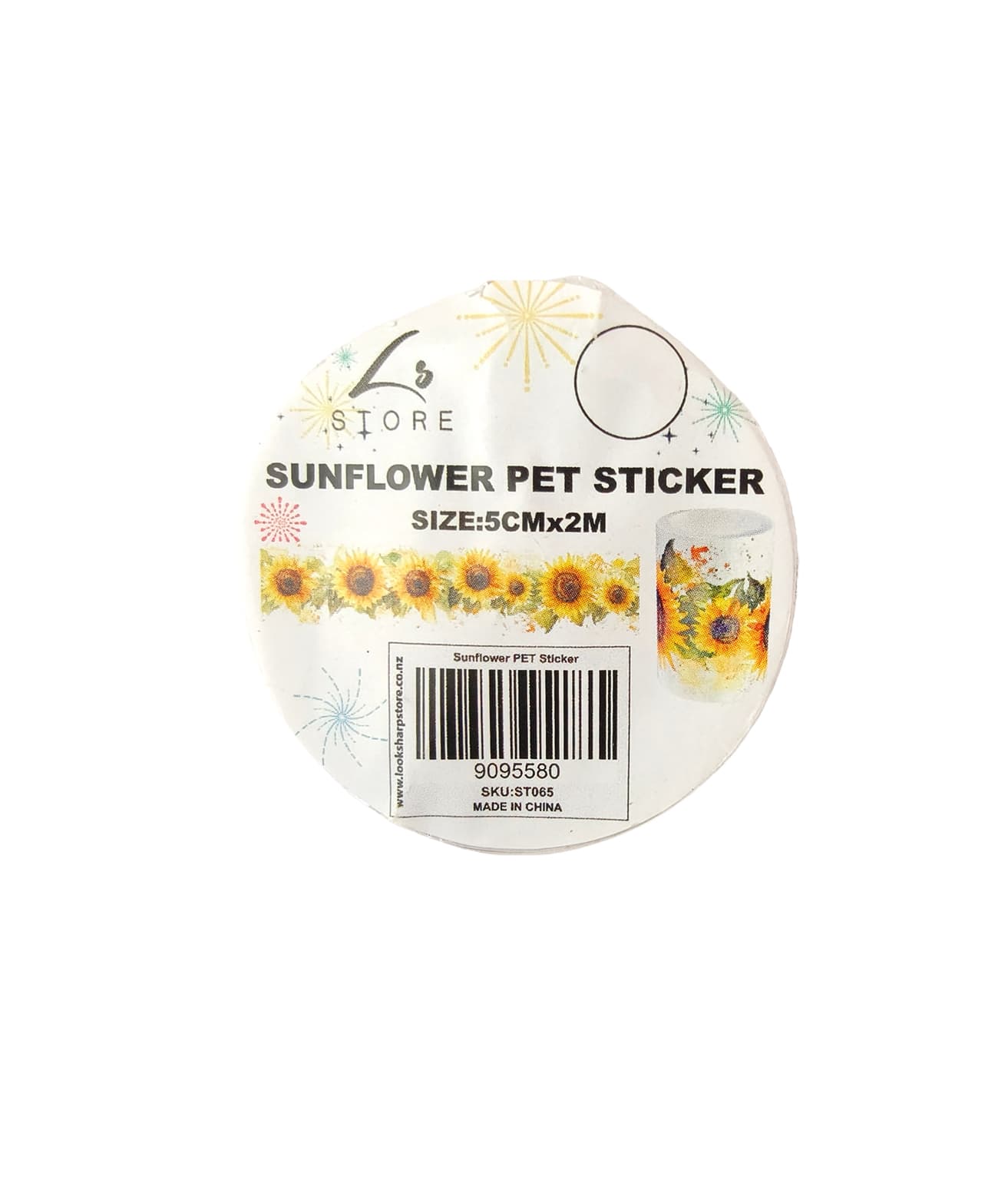 This Sunflower PET Sticker Roll (5cm×2m) is a decorative, waterproof tape featuring vibrant watercolor-style sunflower designs, ideal for adding a fresh, cheerful touch to crafts, gifts, and home decor.