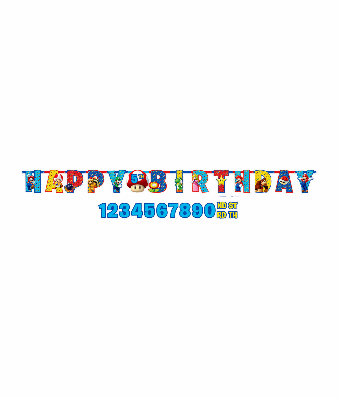This customizable banner features vibrant Mario-themed letters and interchangeable numbers to display any age.