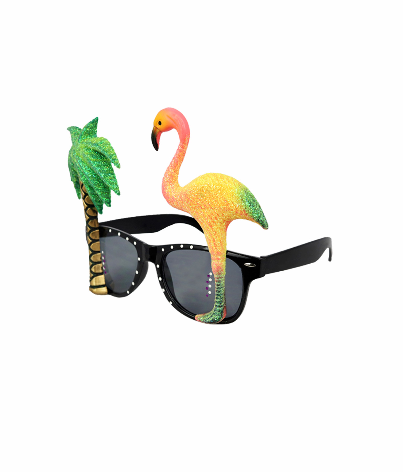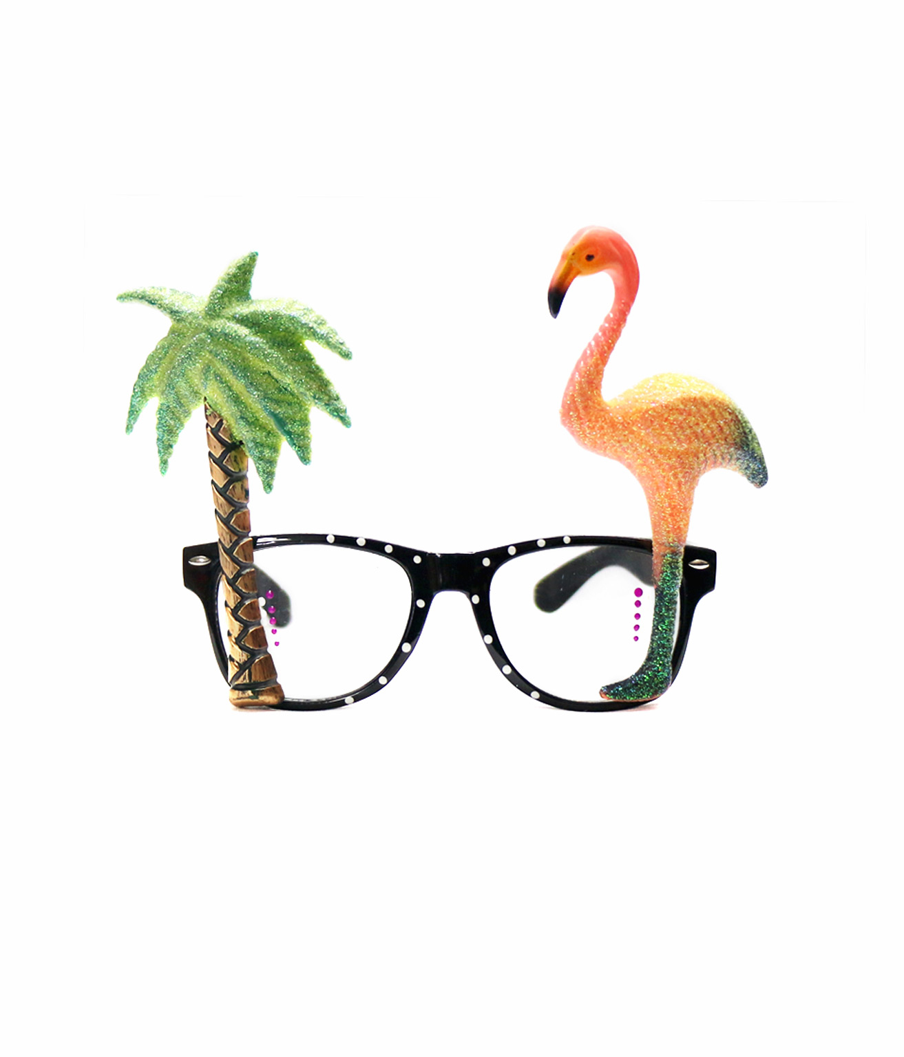 These playful glasses feature a black frame base with colourful flamingo and palm tree shapes around the lenses – perfect for beach parties, luaus, and sunny celebrations.