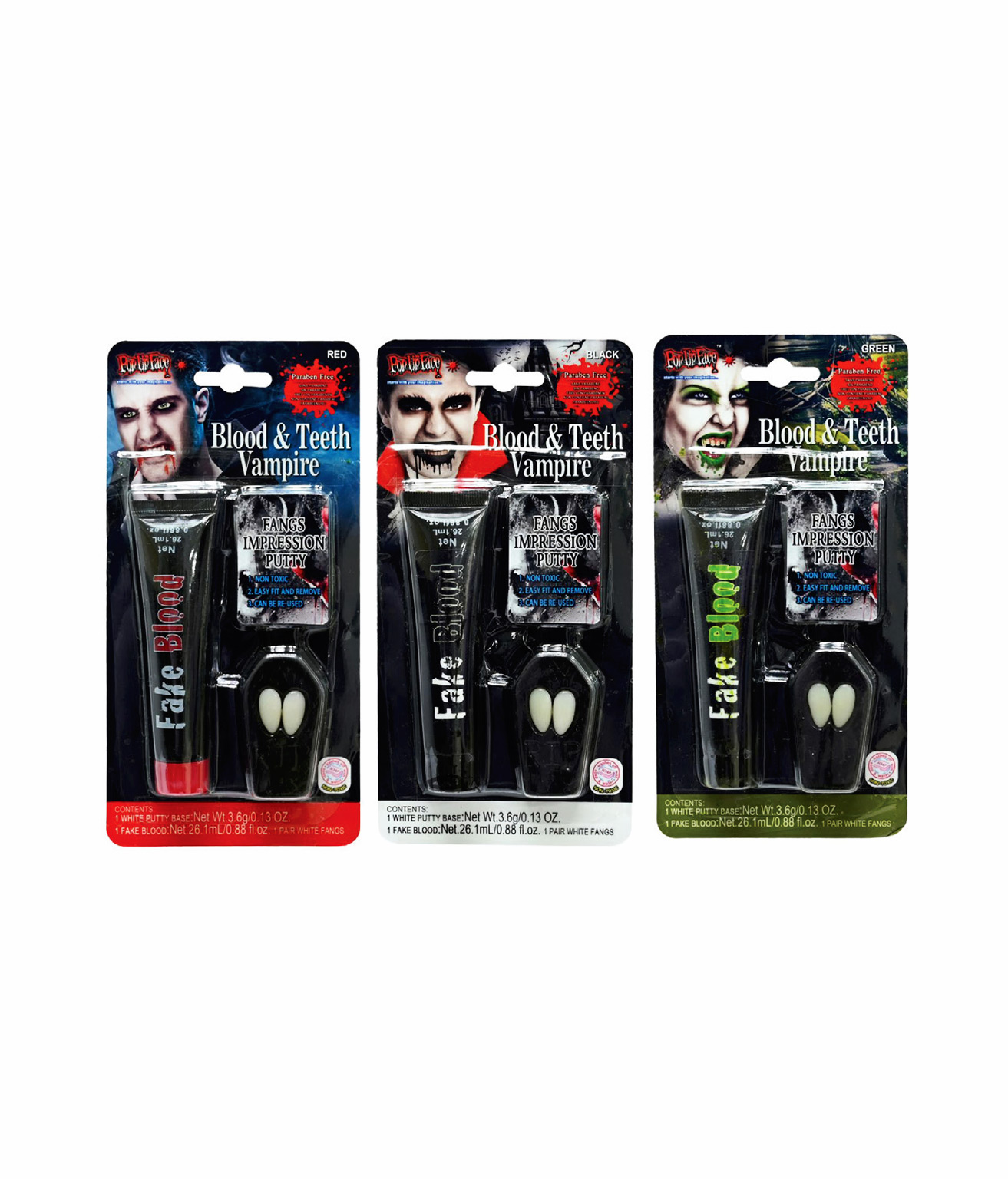 This spooky set includes vampire fangs and fake blood in assorted colours?perfect for completing your undead look.