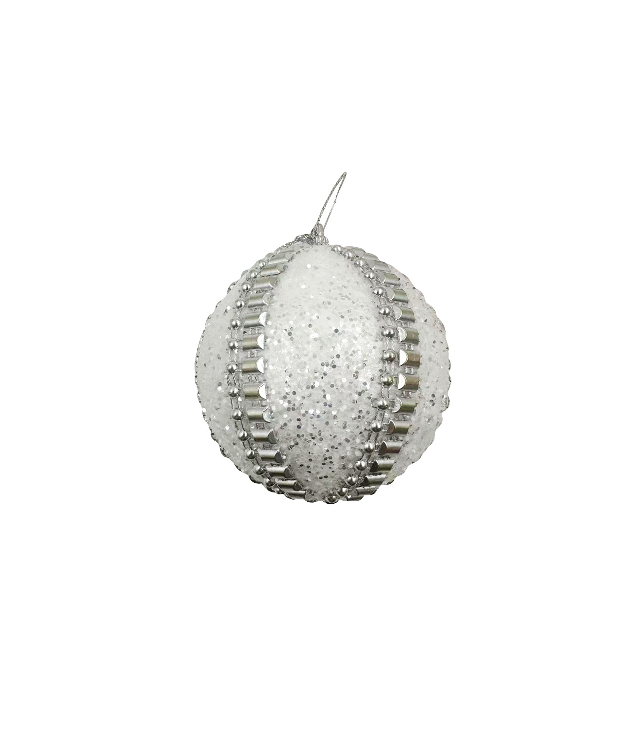 Add a clean and elegant shimmer to your festive setting with the White Christmas Ball With Silver Chain 8cm.