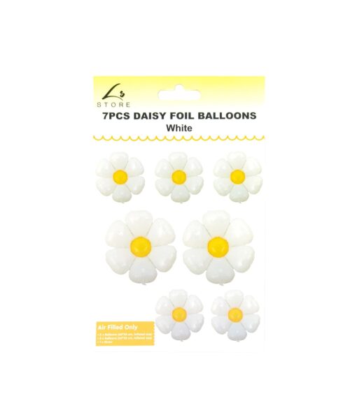 This 7-piece White Daisy Foil Balloon Set features a charming flower design with white petals and yellow centers.