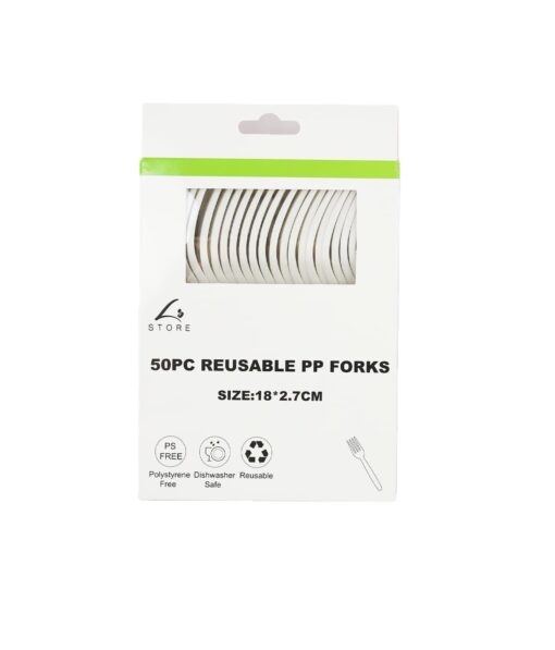 Set of 50 white reusable forks made from durable PP plastic.
