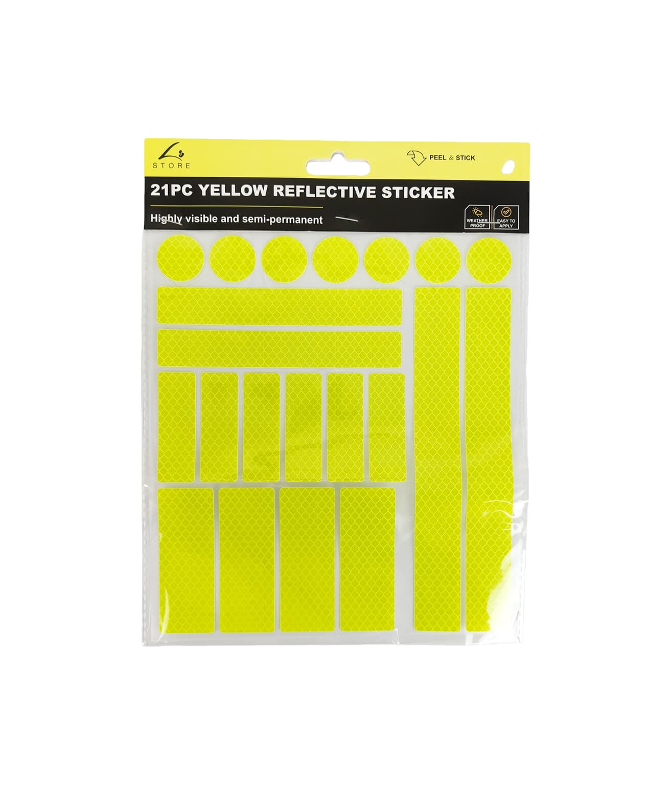 This 21-piece Yellow Reflective Sticker Set is a high-visibility safety accessory, featuring a mix of circular and rectangular shapes designed to boost visibility for a wide range of items and surfaces in low-light conditions.