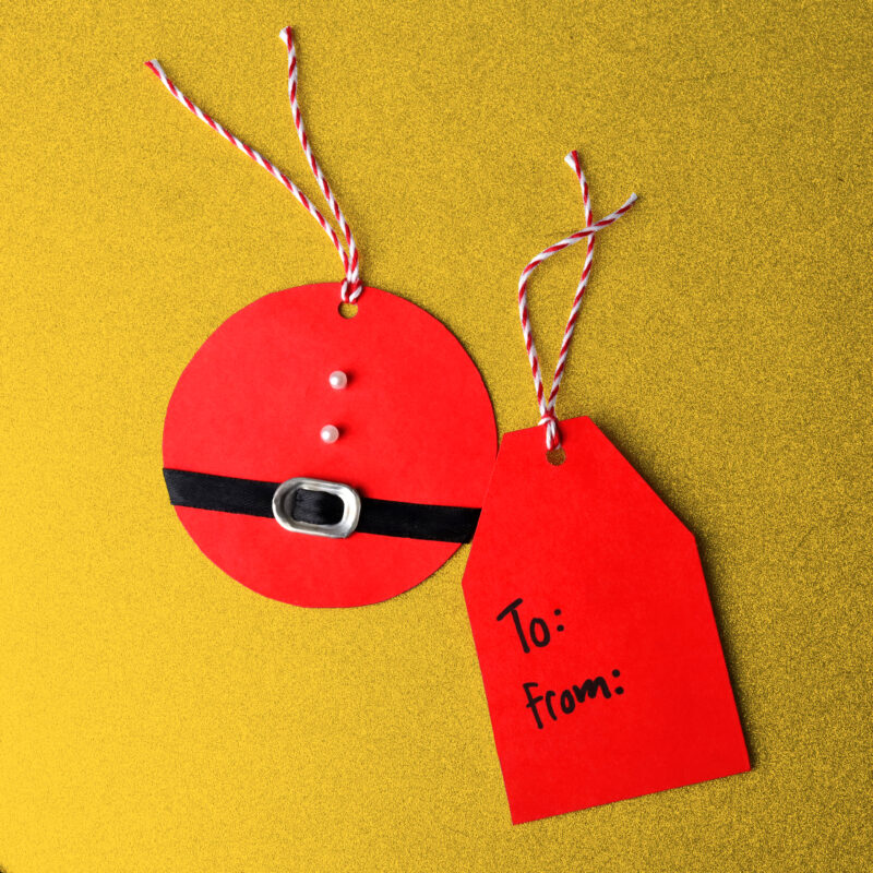 - Trace your desired gift tag shape (a circle or rectangle is recommended) onto the red card.