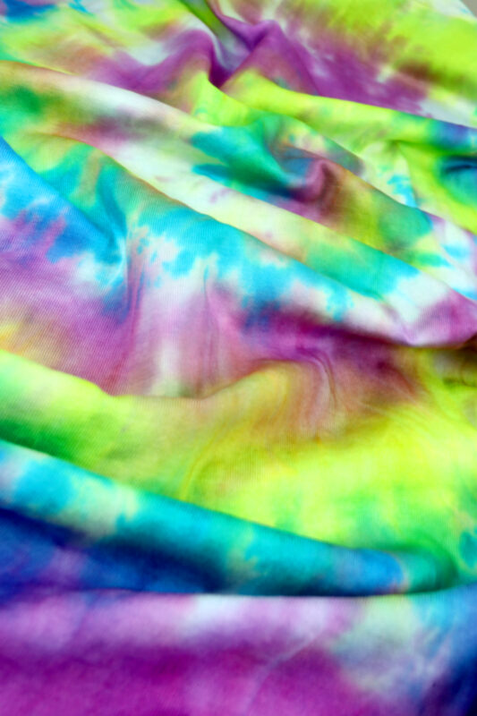 Cover your tie dyed fabric in plastic to keep damp while the dye sets. Let it set for at least 6-8 hours or even longer to achieve the brightest colours. After your fabric has set for the recommended amount of time, fully rinse it under water until the water run off is clear.